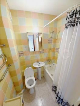 Совместный санузел: туалет, раковина с тумбой, ванна, шкафчик с зеркалом, полотенцесушитель.