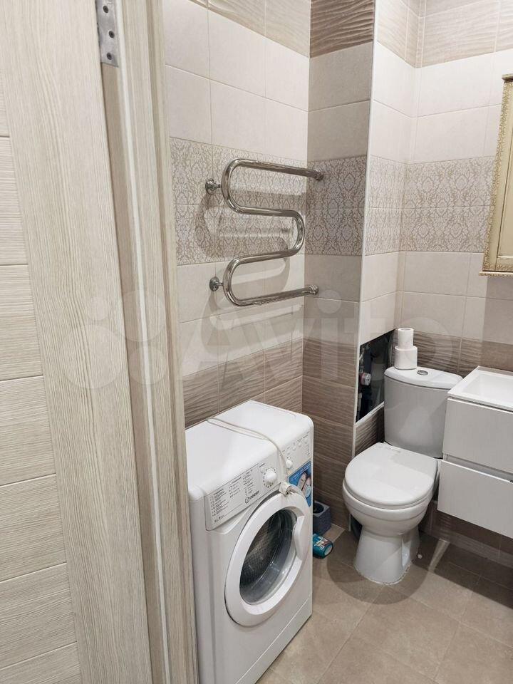 Санузел раздельный, оформлен в современном стиле, оснащен водонагревателем и стиральной машиной. В прихожей предусмотрены удобные шкафы для хранения вещей.