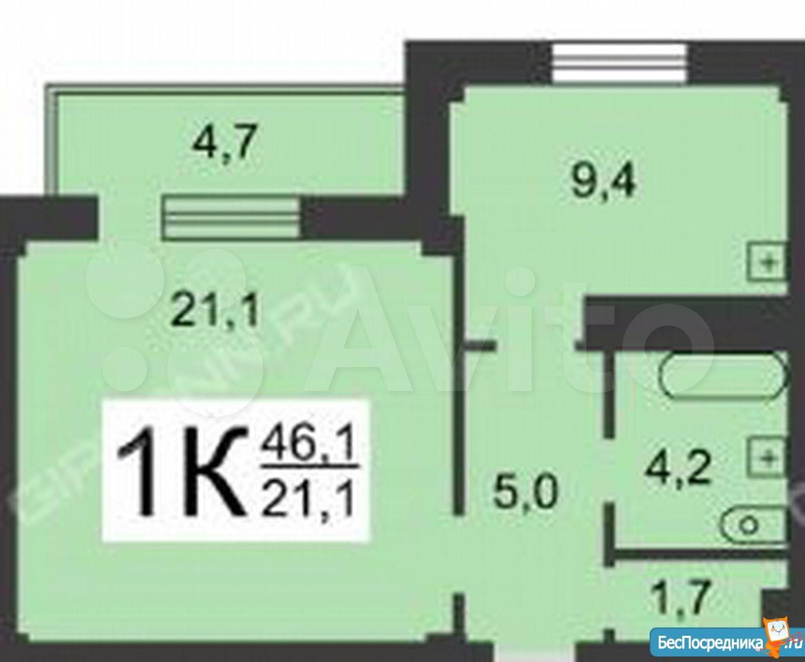 Сдается однокомнатная квартира 46 м² на длительный срок без мебели. При необходимости можно дополнительно поставить шкаф и холодильник.