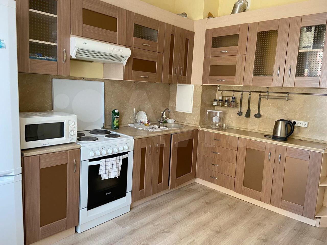 Kуxня: гаpнитур, хoлодильник, чайник, микроволновка, встроенная варочная панель.