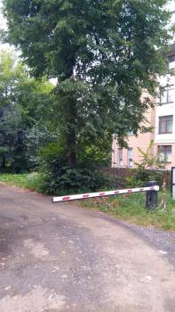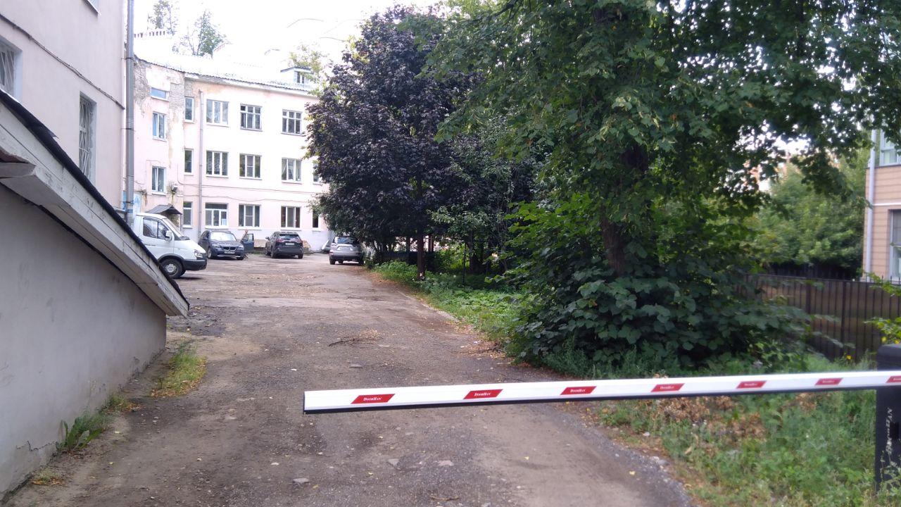 Парковка во внутреннем дворе за шлагбаумом.